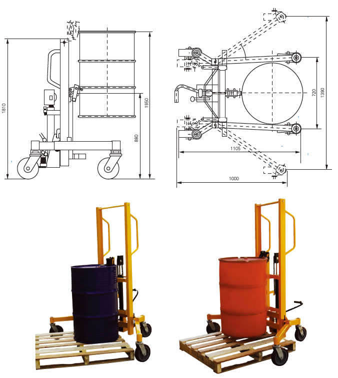 * Ergonomic lifts. Transports, and places poly, steel, or fiber drums on or off pallets.
