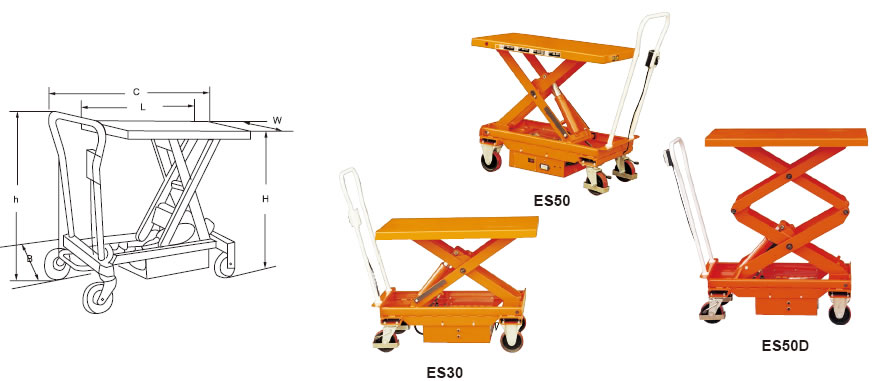 | Model | Capacity | Table Size | Table Height | Lifting Cycle | Wheel Dia. | Lifting/Lowering Time | Overall Size | Net Weight |